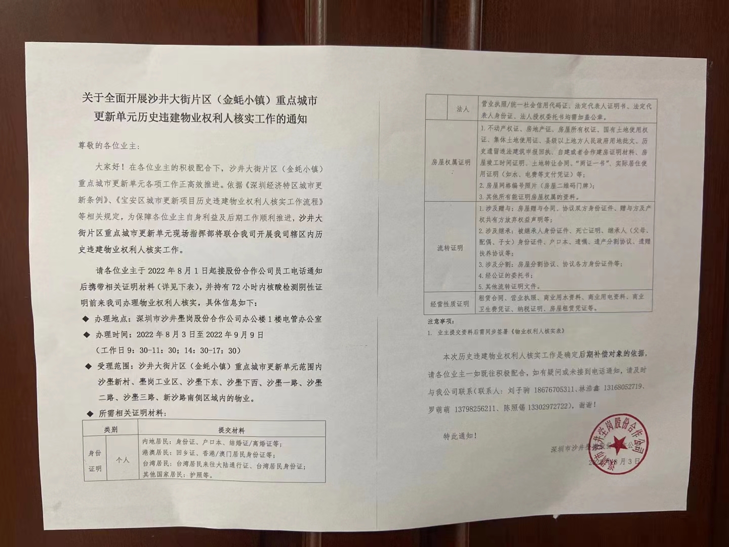 關于全面開(kāi)展沙井大(dà)街(jλ★$€iē)片區(qū)(金(jīn)蚝小(xiǎo)鎮)重點城(ché× ng)市(shì)更新單元曆史違建物(wù)業(yè)權利人(rén)核實★•γ工(gōng)作(zuò)的(de)通(tōng)知(zhī)。